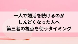 婚活・恋愛 一人で婚活を続けるのがしんどくなった人へ|第三者の視点を使うタイミング 恋愛や婚活を一人で続けるのがしんどくなった人へ。第三者の視点を使うべきタイミングや、自分が今どの段階にいるのかを整理します。 2026.01.11 婚活・恋愛