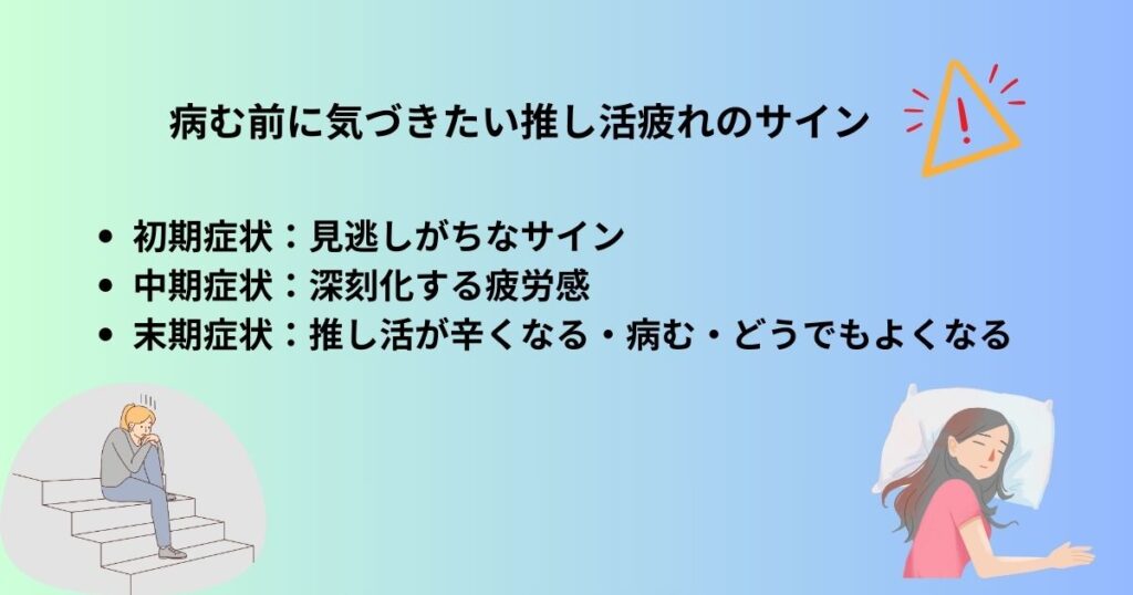 病む前に気づきたい推し活疲れのサインについて、以下の順でご紹介します。