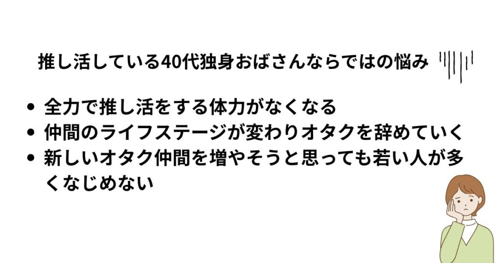 推し活している40代独身おばさんの悩みについては以下の3つに大きく当てはまります。