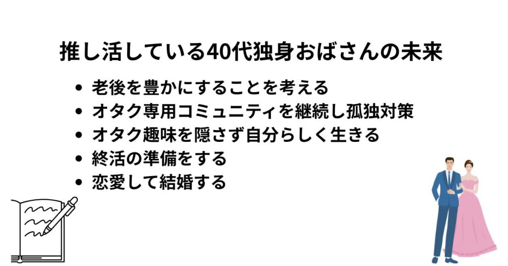 今後の推し活している40代独身おばさんの未来については以下の5つのことを念頭に対策してみましょう。