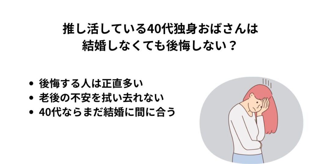 推し活している40代独身おばさんは、こういった不安を感じている人が多いようです。