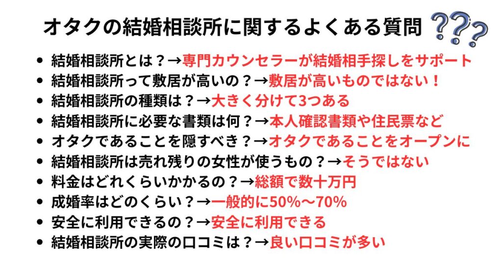 オタクの結婚相談所に関するよくある質問には以下があります。
