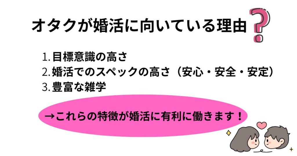 恋愛に苦手意識があったとしても、「目標達成型」の思考を持っているオタクにとって、婚活は取り組みやすい分野と言えるのです。