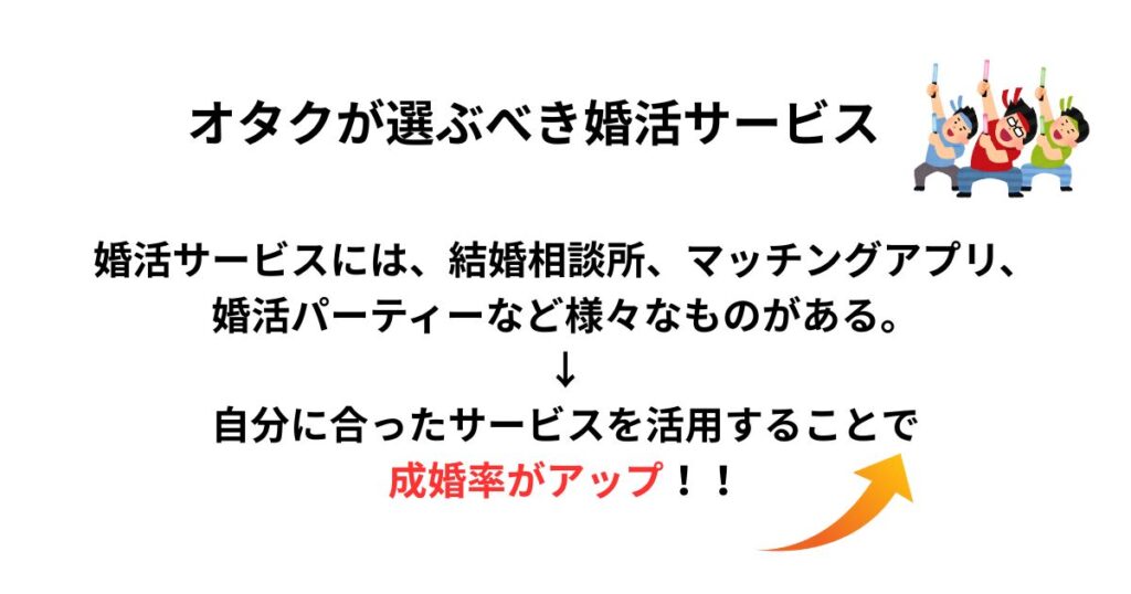 オタクの方は、オタク友達など自然に出会う相手と結婚するのもいいですが、選択肢をより広げるために婚活サービスを利用することをおすすめします。