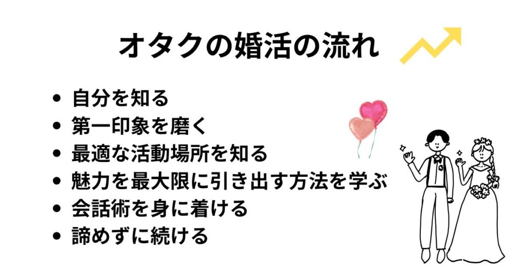 このようにオタクが婚活前に自分磨きをして魅力を高めることで、様々なメリットが得られ、結果的に結婚に結びつきます。