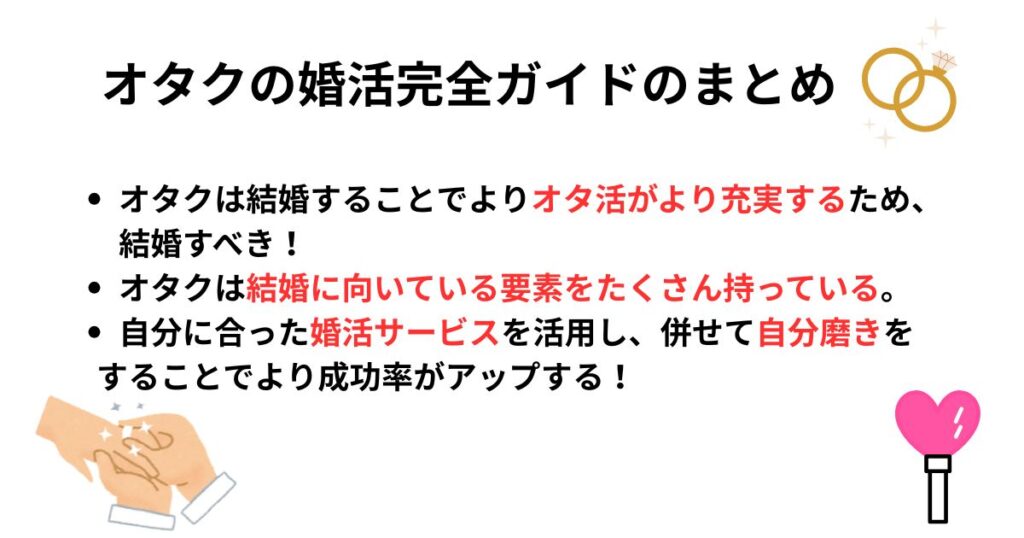 ここで紹介しているオタクこそ結婚すべき理由について、「オタクが結婚すると幸せになれる理由を解説!データで証明」の記事ではより深堀して解説していますので、ぜひ参考にしてみてください。