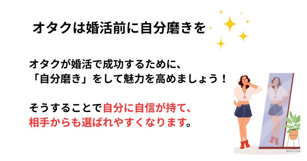 オタクが婚活で成功するためには、「自分磨き」をして魅力を高めることが大切です。