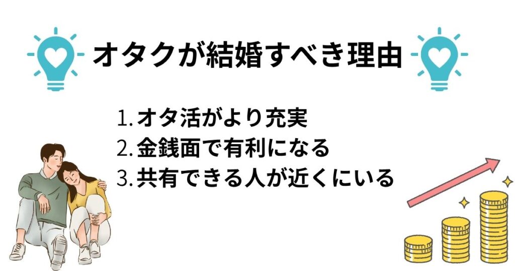 オタクが結婚すべき理由は、大きくわけて以下の3つがあります。
